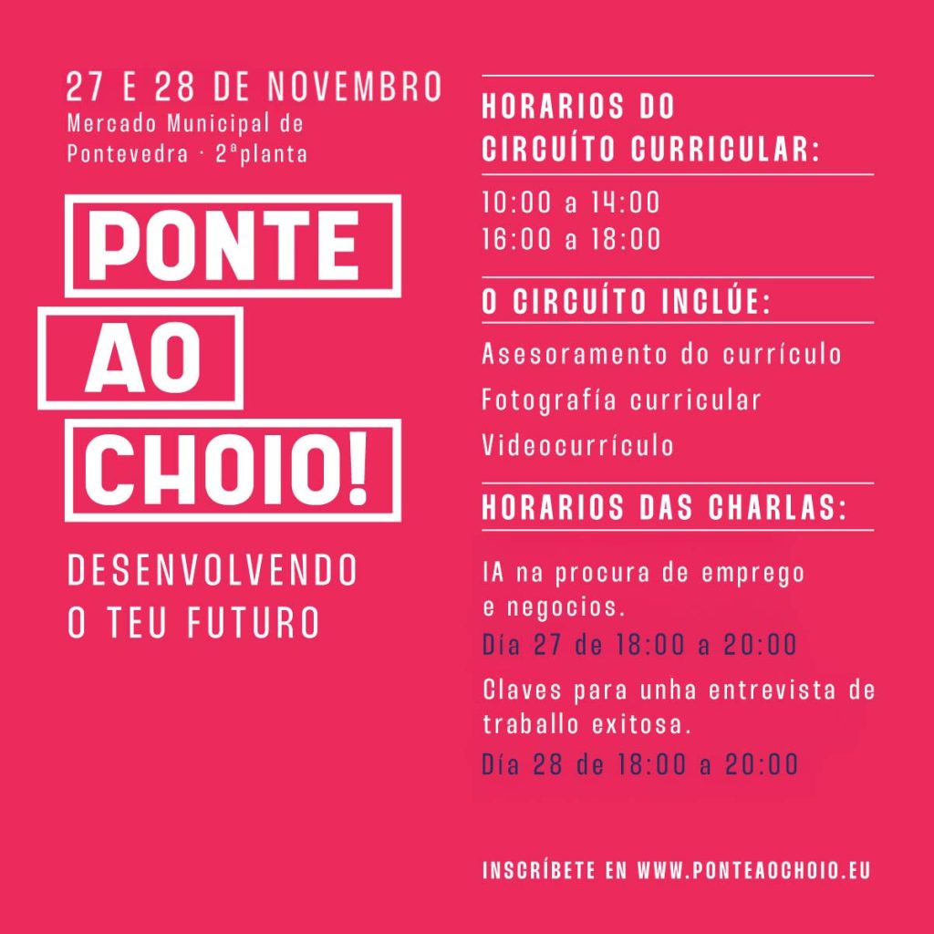 “Ponte ao Choio” é un proxecto de emprego e emprendemento impulsado polo Concello de Pontevedra, orientado a mellorar a empregabilidade e activar o talento local.